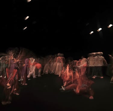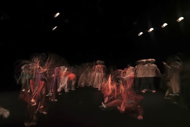 Nuestra práctica está centrada en la creación de experiencias híbridas que fusionan diversas disciplinas como el movimiento, el video, la escritura y el arte sonoro. Tenemos interés por la memoria, el territorio y la espiritualidad. Exploramos formas de activar lo invisible y lo intangible, utilizando el cuerpo y el ritual colectivo como medios para generar espacios de reflexión sobre los afectos y la transformación cultural